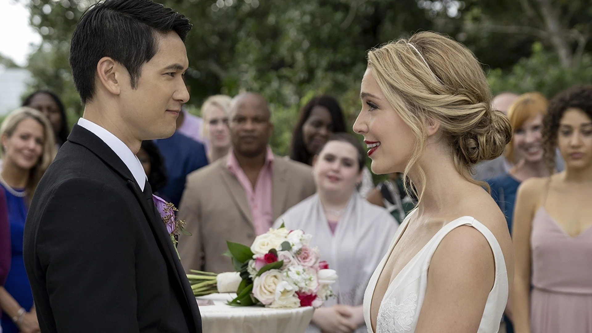 Jessica Rothe and Harry Shum Jr. are cute. I don’t think they lack onscreen chemistry; the paper-thin script just doesn’t provide them with anything even remotely intimate or outside the realm of cliches of the genre. They make the most out of the little material they’re given with their adorable wit and charm. I gotta give a backhanded compliment to the casting director more so than the cast. Rothe and Shum Jr. don’t even resemble the real-life figures they’re based on. When the film ends on real footage from the real couple’s wedding, it makes you question how they got away with the casting choices in the first place. However, the leads are so damn attractive and they’re really good performers. It’s refreshing to see Harry Shum Jr. in a leading role, projecting that same charm and talent that I remember from his days on Glee as Mike Chang (and no, I’ve never seen Shadowhunters). There’s a scene where Sol sings Jen “their song” in a huge romantic gesture in the park before he proposes and hearing Shum Jr. sing again felt like home. He still got it.