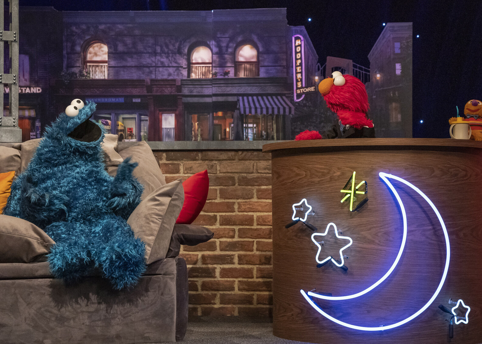 Before Elmo heads off to bed, he gets dressed and hosts his own late-night show in front of a studio audience filled with kids and muppets. As he dons the duties of a host, other familiar faces from 123 Sesame Street appear in various roles, such as Cookie Monster the co-host, Rosita the stage manager, Prairie Dawn the director, Bert & Ernie as directors, Abby Cadabby the staff writer, and even Oscar the Grouch as the Matt Damon joke, for they run out of time for him. Each episode features one or two celebrity guests that Elmo interviews, which leads to some adorably chaotic and wacky scenarios.